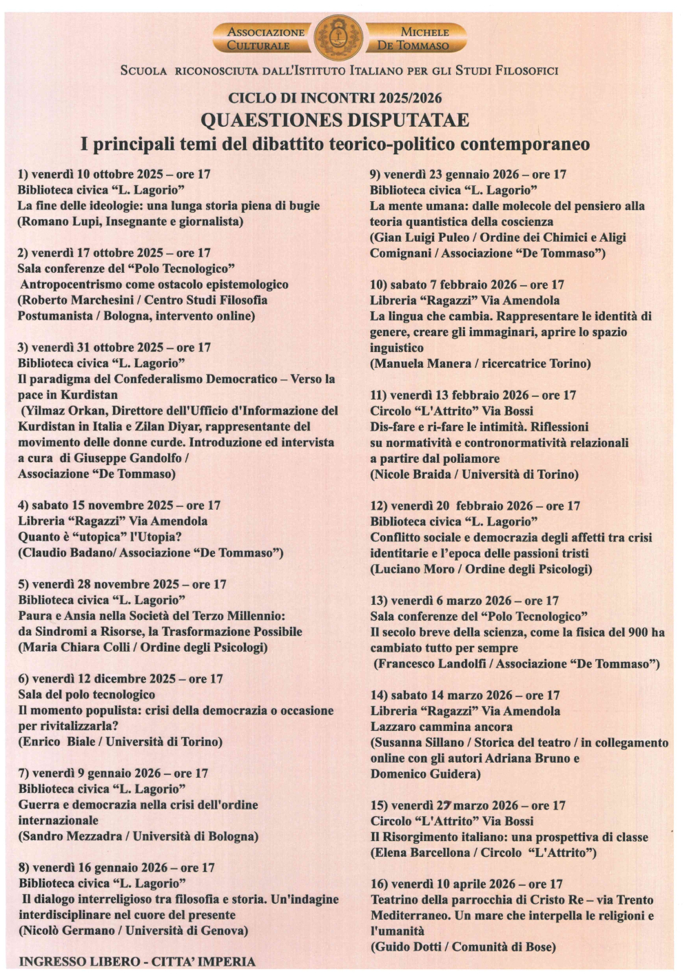 Ciclo di incontri di filosofia anno 2025/2026 a cura dell'Associazione Culturale Michele De Tommaso di Imperia presso la Sala Convegni della Biblioteca Civica L. Lagorio.
